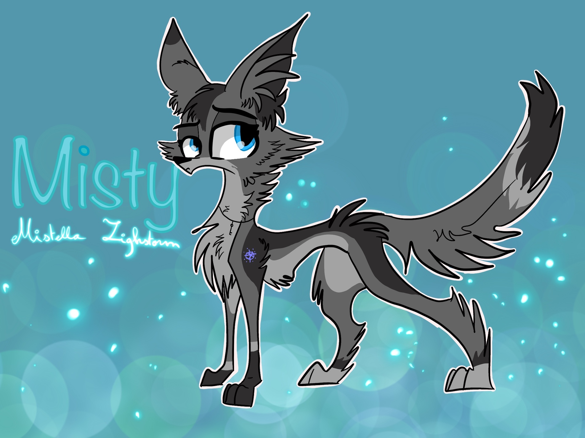 When Misty was still young, she was very beautiful, as on her reference (here she is approximately 30 years old), she has blue eyes and she is gray with more or less dark spots. As you can notice on her left shoulder, she has the sign of "the compass". She lived all her life with her lover Zurg near the sea, so they created compass symbols on their shoulders that bind them.